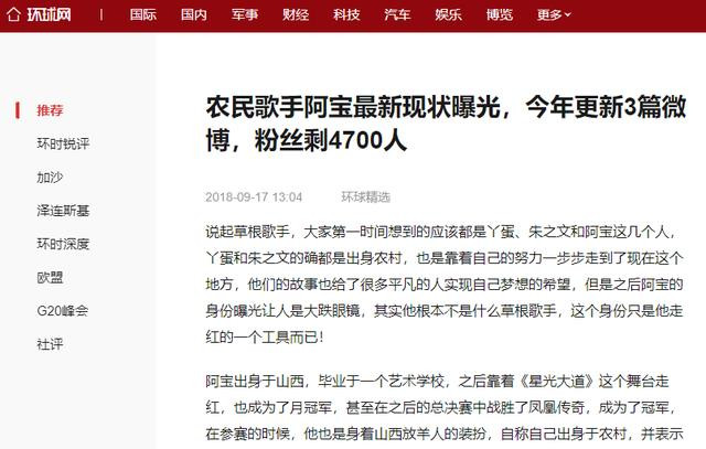 环球网2018年9月17日——农民歌手阿宝最新现状曝光,今年更新3篇微博,粉丝剩4700人