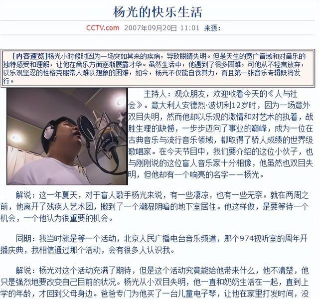 三年的时间,杨光过着艰苦的生活,没有人关注到这么一个盲人歌手。直到《星光大道》的机会出现。
